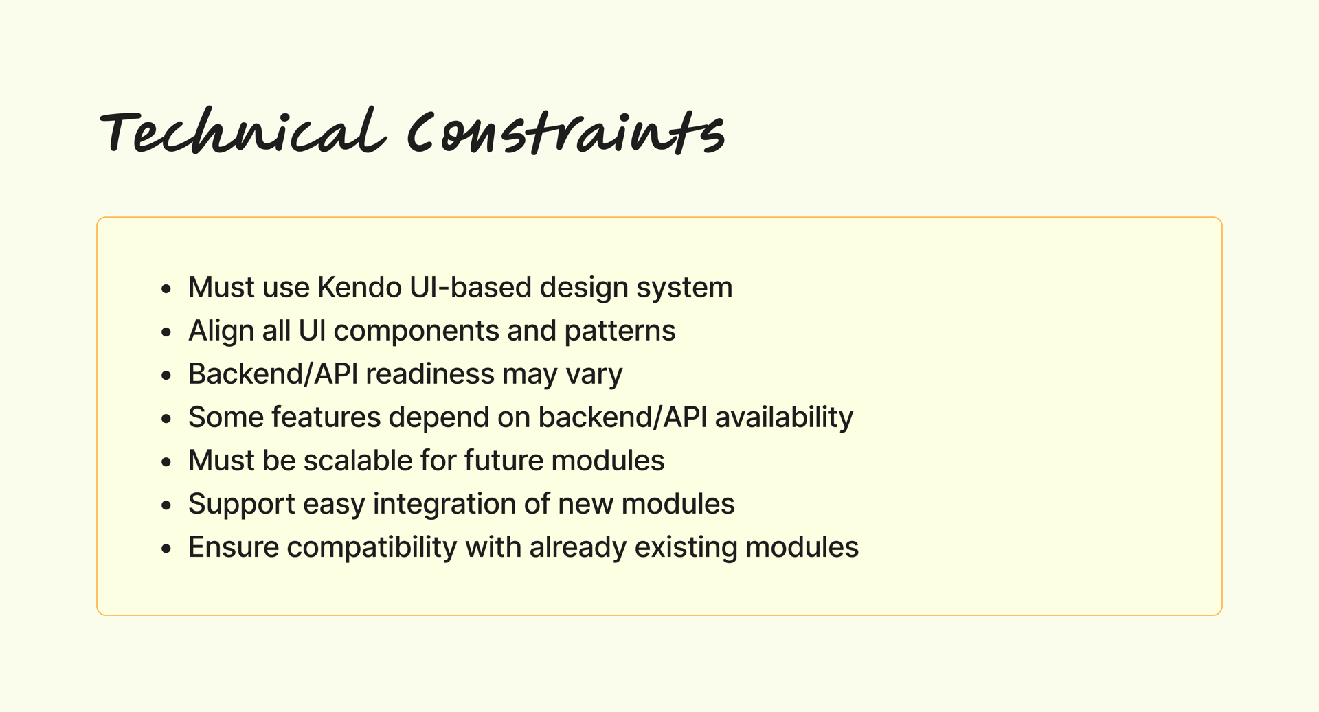 Engineering - flagged feasibility constraints before full design commitment, allowing structural decisions to scale across the Angular/Kendo architecture.