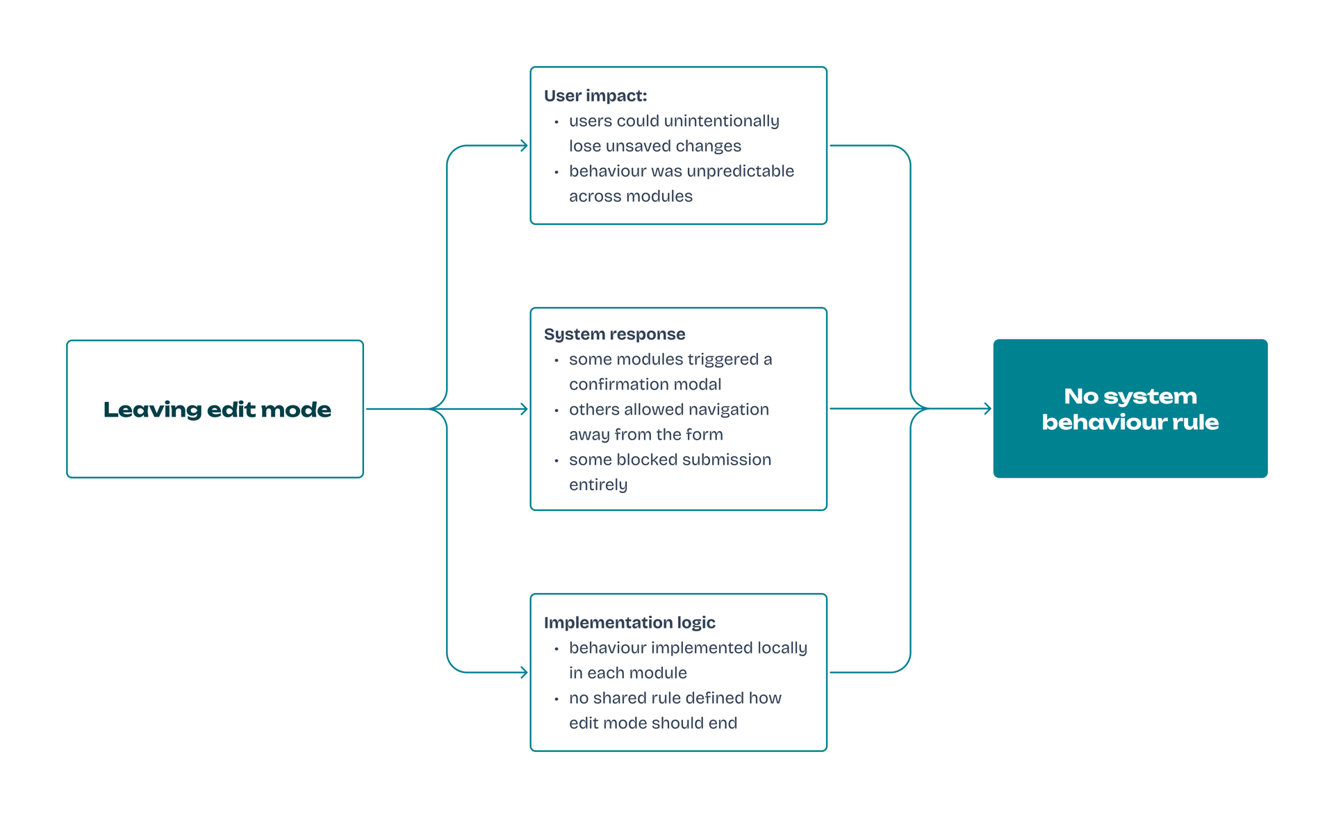 The goal was to understand how the same user actions behaved across modules and where behaviour diverged.