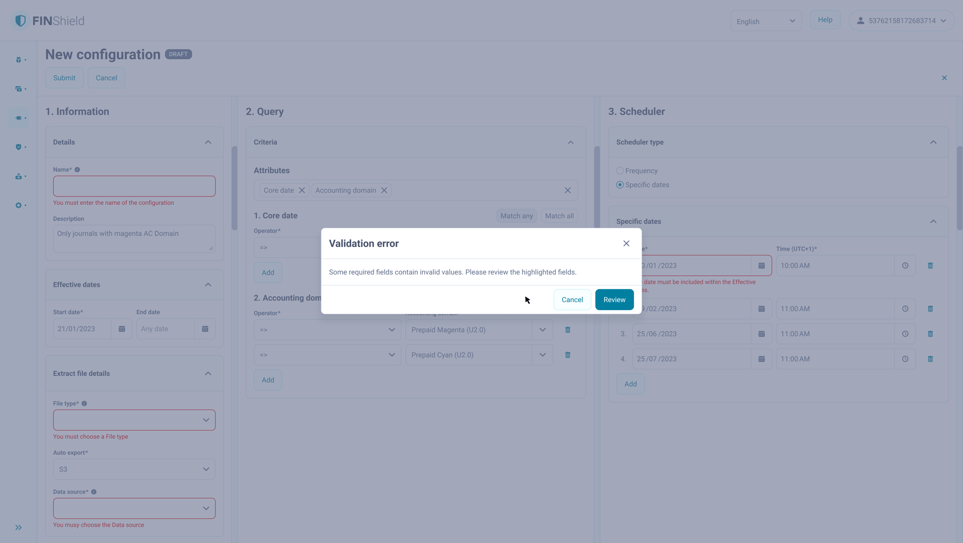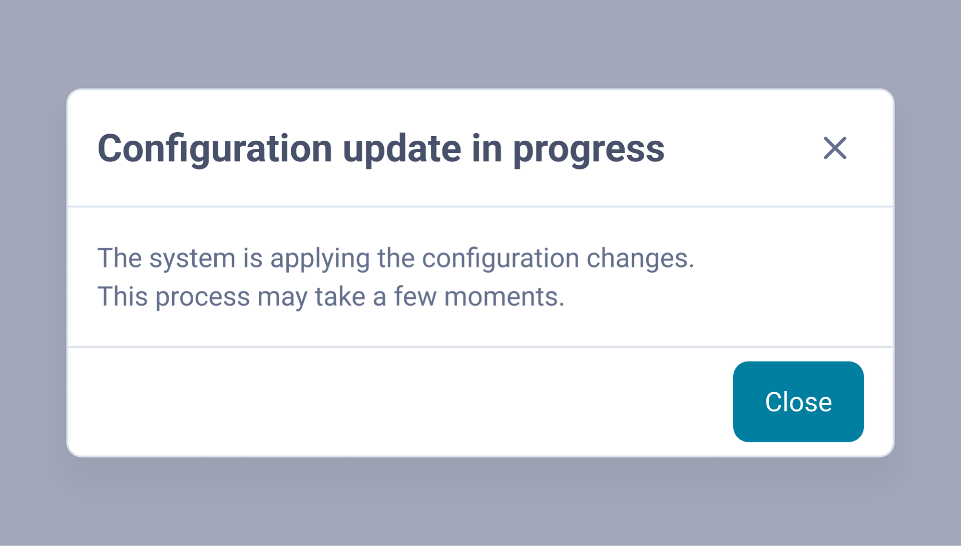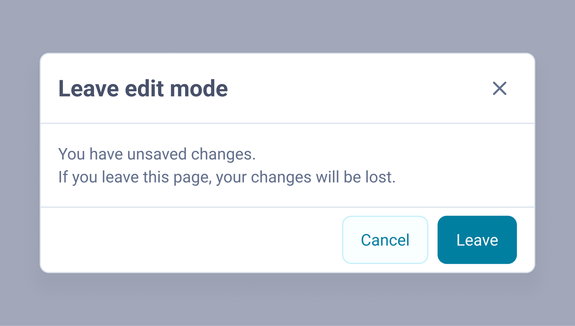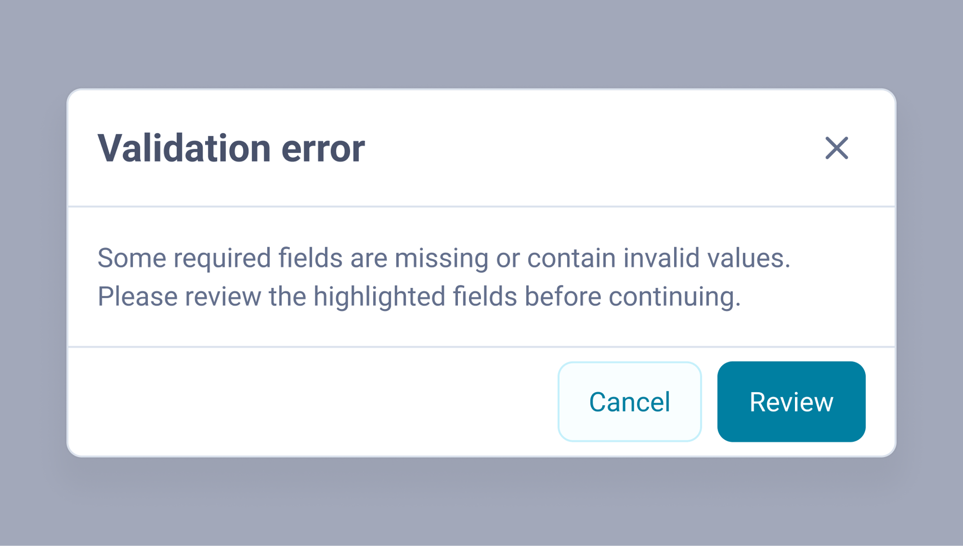 Modals appear whenever the system requires user acknowledgement (include validation errors, warnings or workflow interruptions).